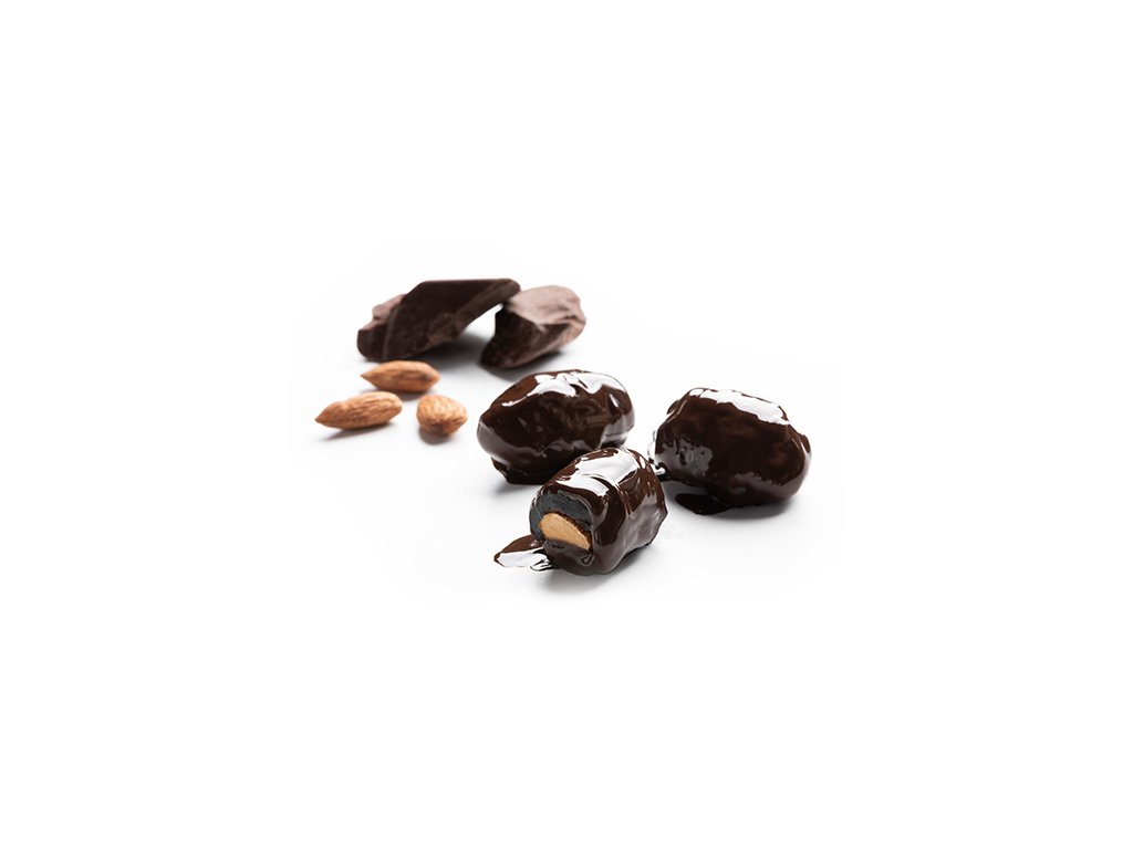 Šťavnaté datle v lahodné vrstvě kvalitní hořké čokolády s křupavou mandlí uvnitř