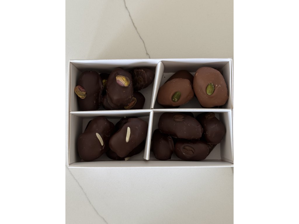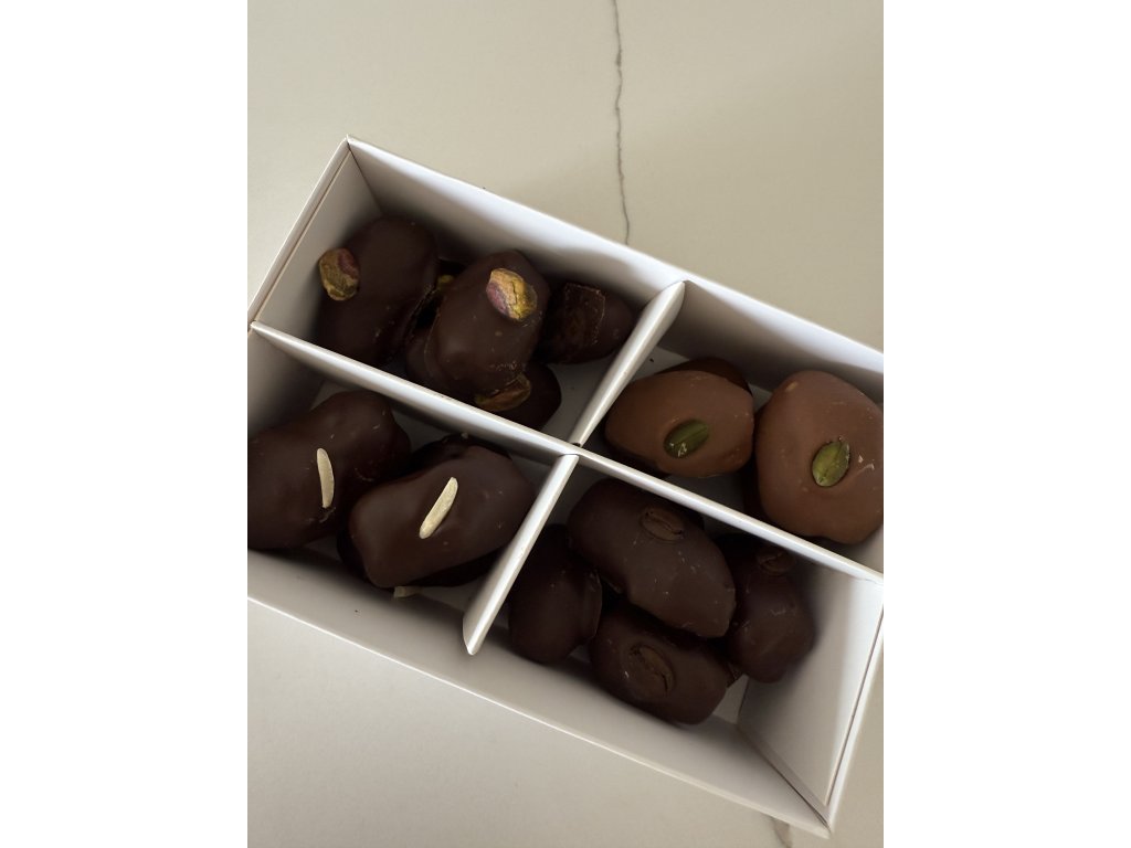 Tyto datle pro vás ručně plníme nejlepšími ořechovými másly a obalujeme v 64% hořké čokoládě.